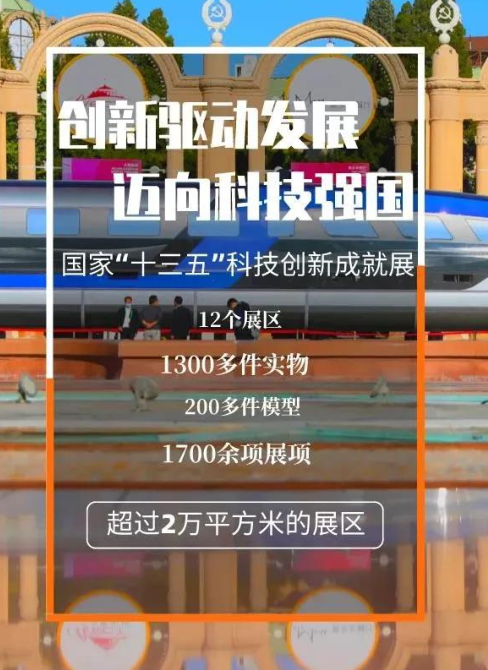 10月21日至27日,以“创新驱动发展 迈向科技强国”为主题的国家“十三五”科技创新成就展在北京展览馆举行,此次展览重点展示我国深入实施创新驱动发展战略、建设创新型国家所取得的重大成果。展览分为百年回望、基础研究、高新技术、重大专项、农业科技、社会发展、区域创新、开放合作、科普等12 个展区。