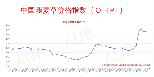 2021年10月份中国燕麦草价格指数1.42,环比上月下降0.04,和去年同比上涨了35.2%。进口燕麦草外盘小幅上涨,主要仍是海运费的上涨,到港量和上月基本持平。2021年10月份人民币平均汇率同9月份相比小幅升值。港口提货价格无变化,仍以低等级为主。内蒙古燕麦草随着天山二茬草上市,海拉尔、霍林河、张北地区燕麦草上市,地头装车价格小幅下降,但仍处于高位。甘肃燕麦草部分上市,装车价格小幅回落,总体价格高于牧场的预期,大量上市后,仍有小幅回落的空间。预计2021年11月份,进口燕麦草到港量有所回落,进口新草即将上市,从目前澳洲打捆的进展看,有出口资质的三家公司所处的维多利亚洲,燕麦草质量明显好于去年,高等级的草比例增加,均价有所上涨,数量有所提高。由于国内牧场配方调整,对进口燕麦草需求低于往年,供需基本平衡。梯牧草由于美国干旱,海运费高,新草价格偏高,相比进口燕麦草没有竞争优势,牧场采购意愿下降,预计明年进口量会略低于今年。11月份内蒙古燕麦草供应充足,高品质草的价格稳定,低品质草的价格有所回落。甘肃燕麦草受下雪影响,上市进度较慢,价格稳中略降。预计11月份燕麦草价格指数持平或略降。