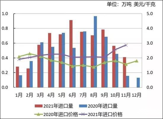 其中,黑麦草种子进口3.10万吨,同比减少21%,平均到岸价格1.53美元/千克,同比上涨18%。羊茅子进口2.02万吨,同比增加73%,平均到岸价格2.05美元/千克,同比上涨9%。草地早熟禾子进口0.75万吨,同比增加149%,平均到岸价格3.43美元/千克,同比下跌5%。紫苜蓿子进口量为0.51万吨,同比增加44%,平均到岸价格3.75美元/千克,同比上涨35%。三叶草子进口0.34万吨,同比增加35%,平均到岸价格4.08美元/千克,同比上涨19%。